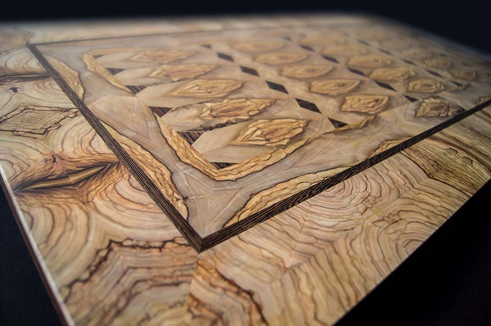 Proprio il legno di ulivo, lavorato con delle speciali tecniche, unite ad una meticolosa ricerca e composizione estetica delle sue venature, assume un eleganza e pregio pari al marmo.