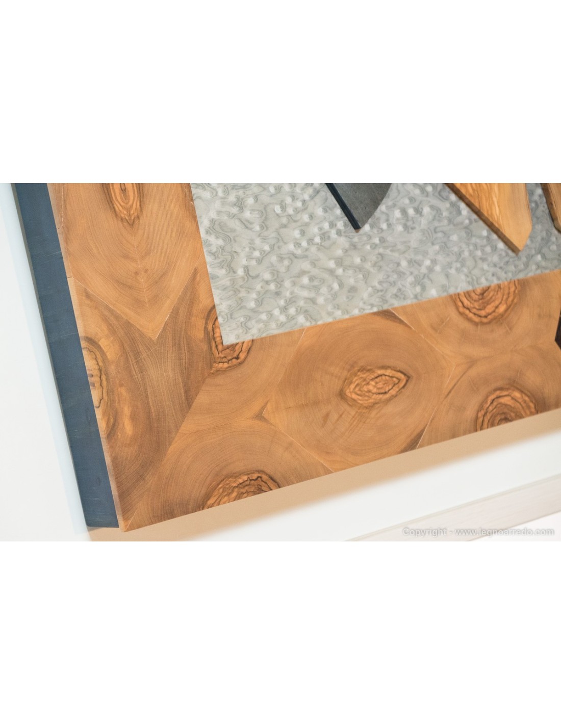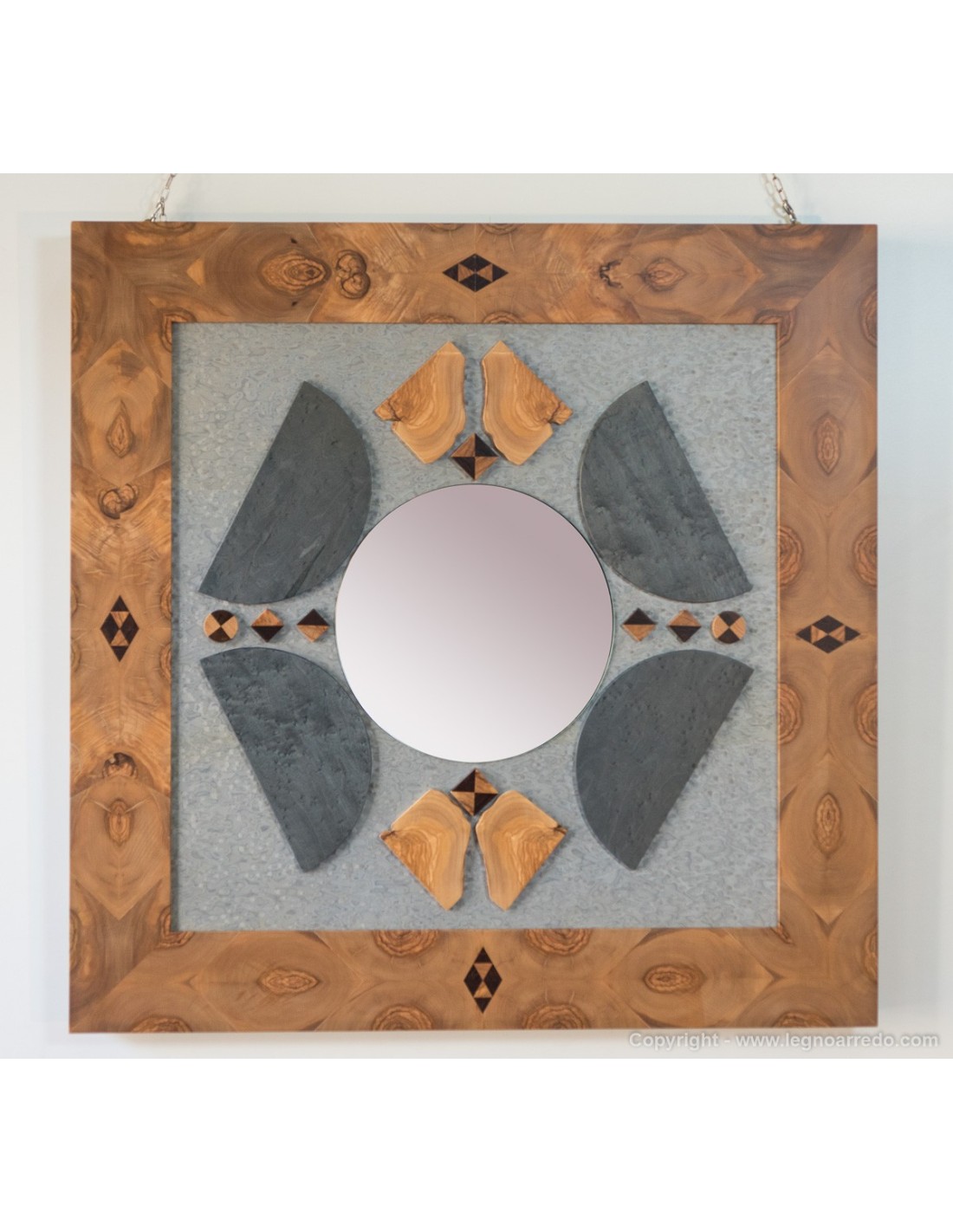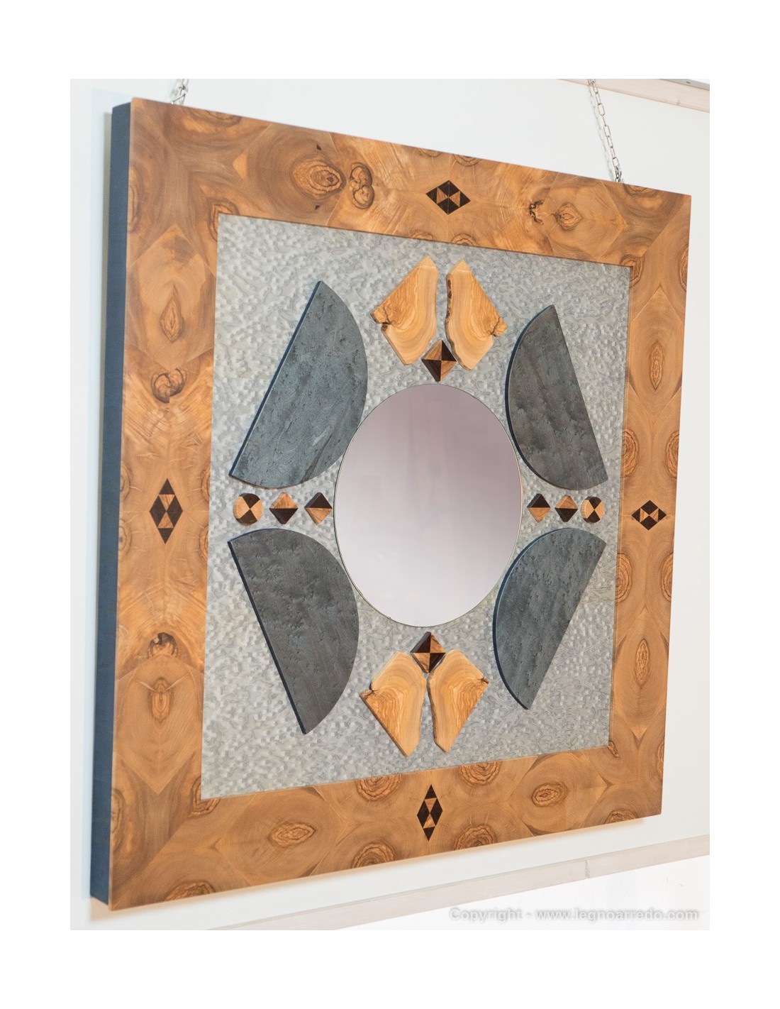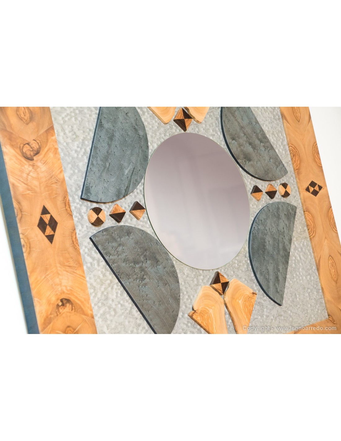 Creazione Specchiera Design (AS-01), costituita da una pregiata ed elegante cornice in legno massello di ulivo, wengé e radica colorata.
