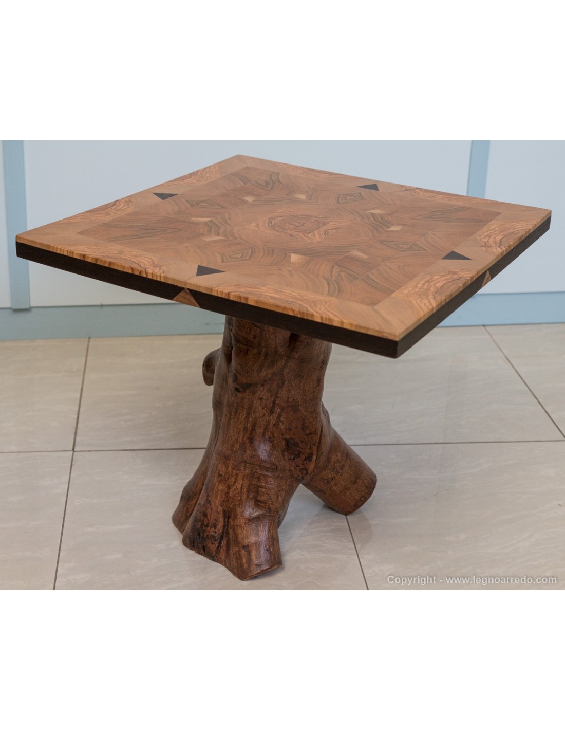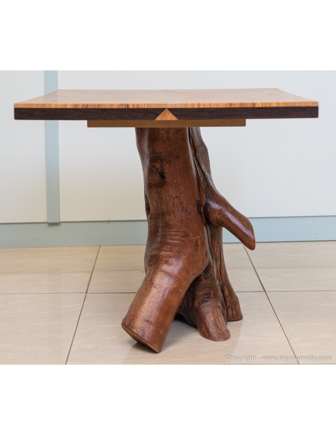 Tavolino Design (AT-05), costituito da un pregiato ed elegante piano d'appoggio in legno massello di ulivo, ciliegio e wengé.