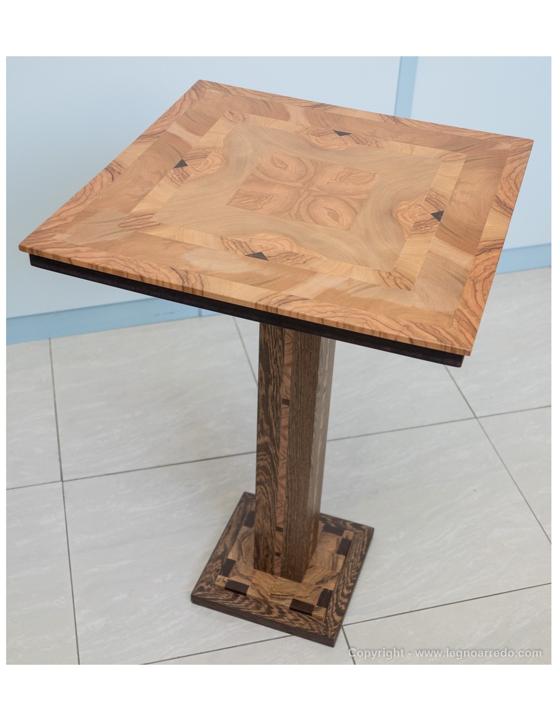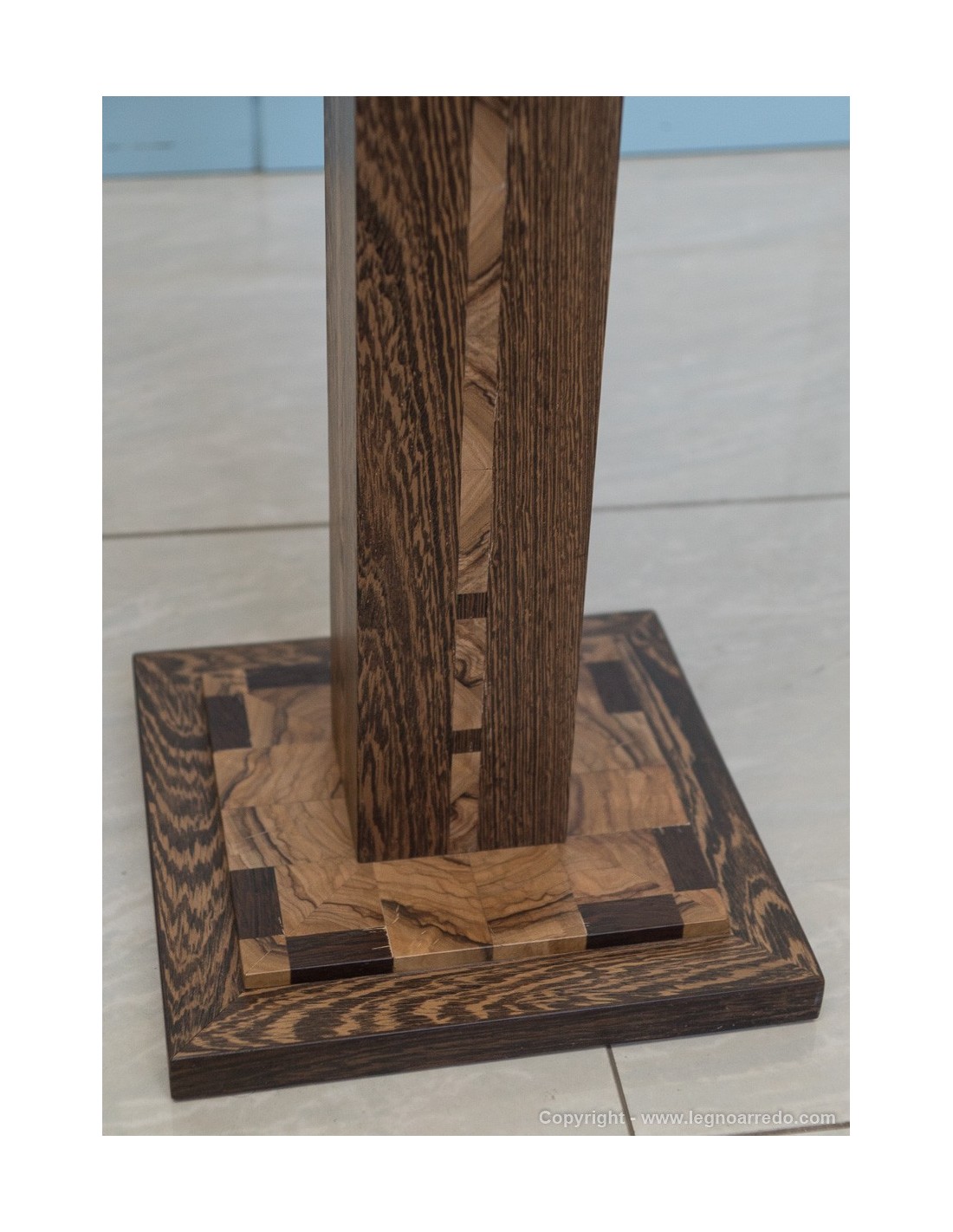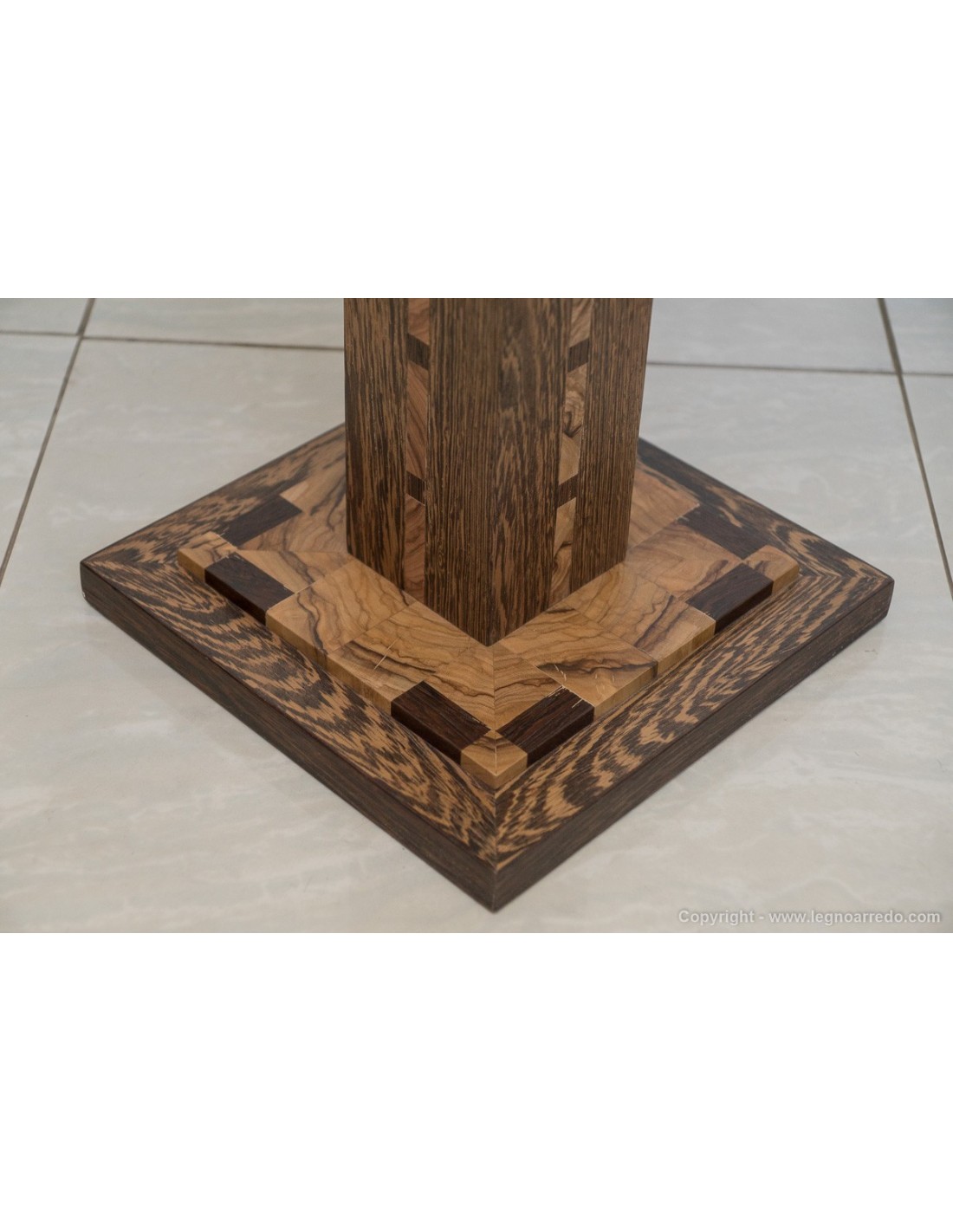 Il design del piede del tavolo è composto da n° 96 pezzi (legno massello di circa 1 cm di spessore) di ulivo e wengé.