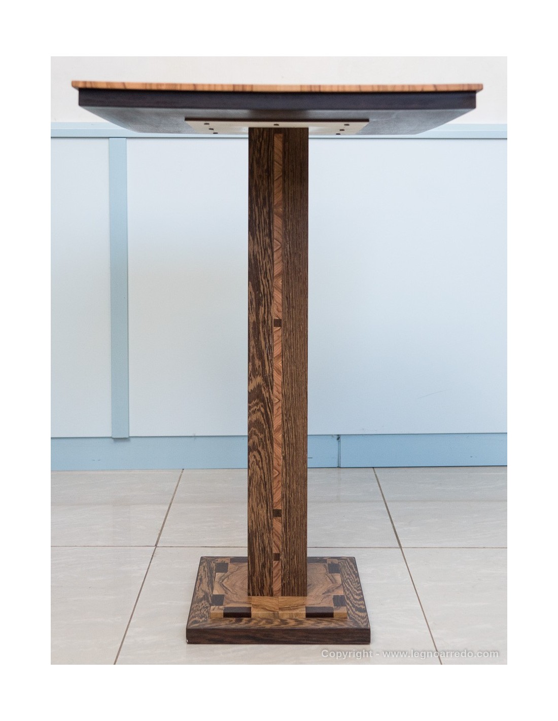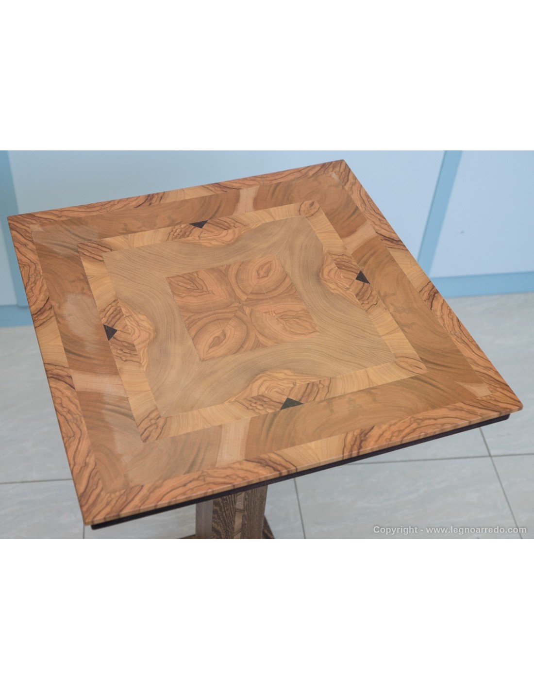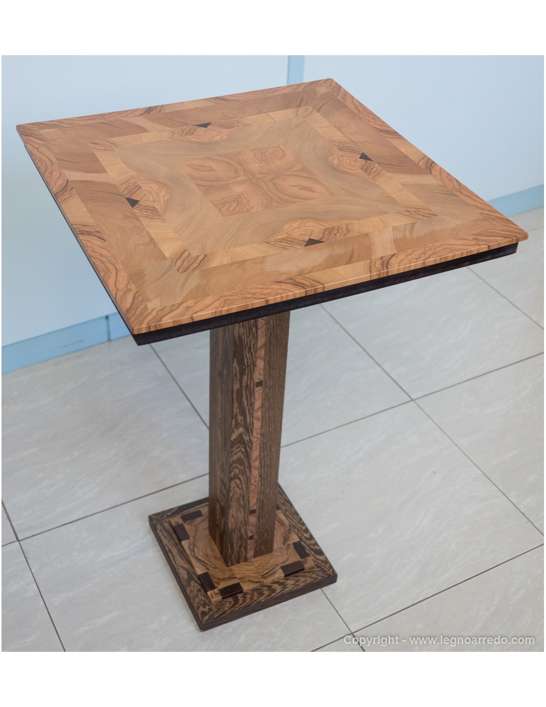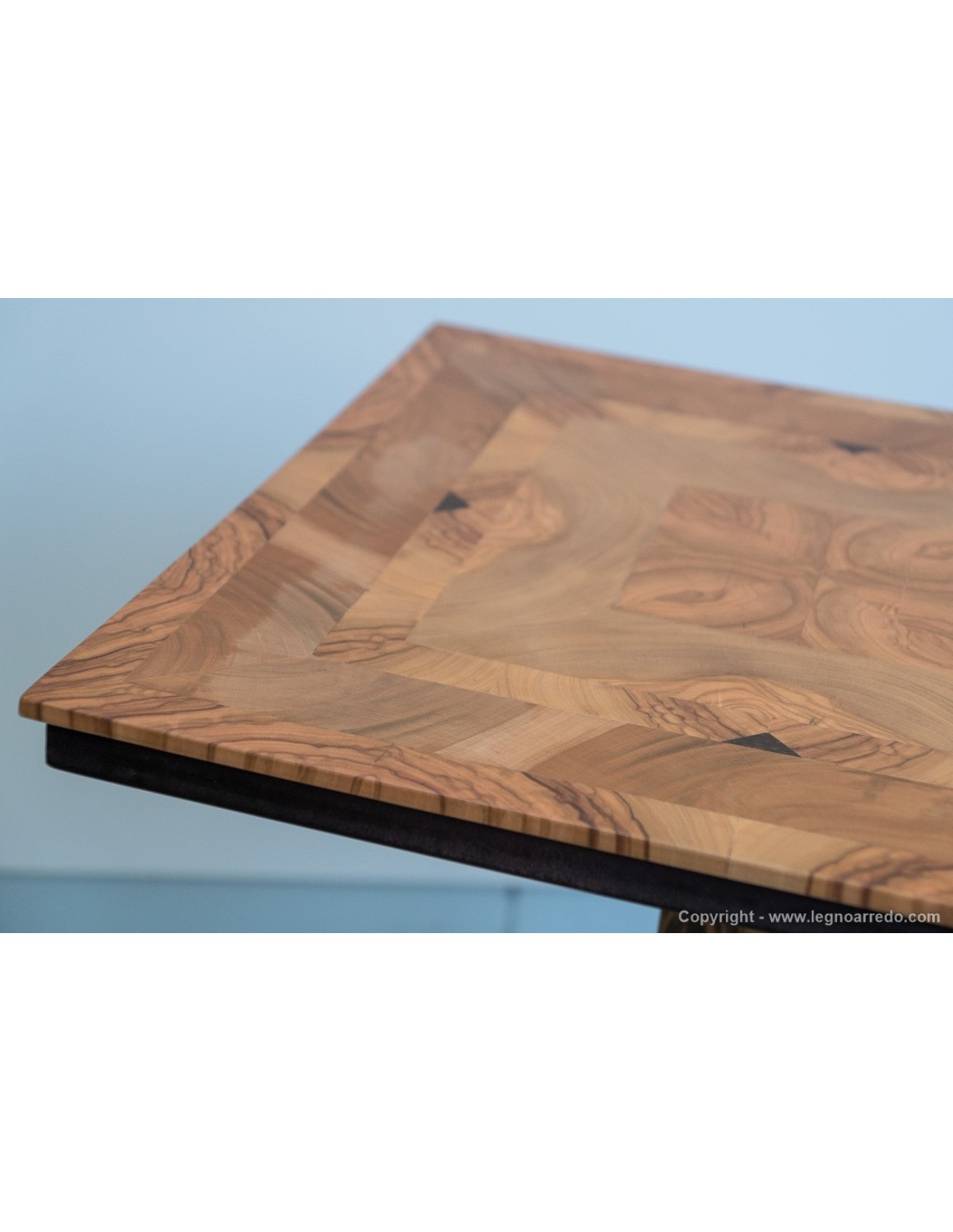 Il design del piede del tavolo è composto da n° 96 pezzi (legno massello di circa 1 cm di spessore) di ulivo e wengé.