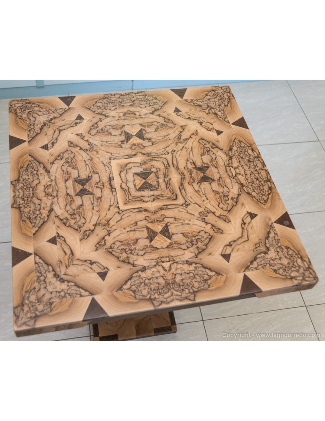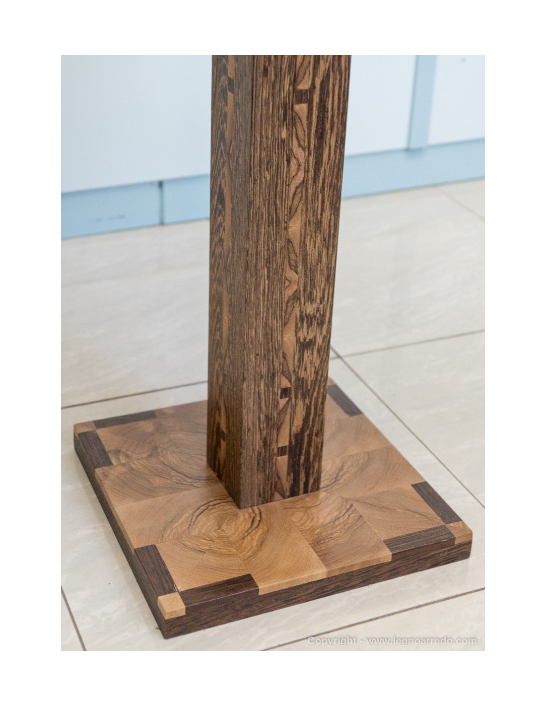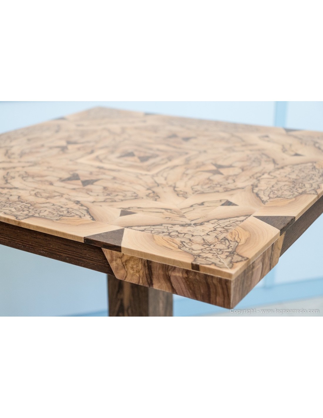Il design del piede del tavolo è composto da n° 96 pezzi (legno massello di circa 1 cm di spessore) di ulivo e wengé.