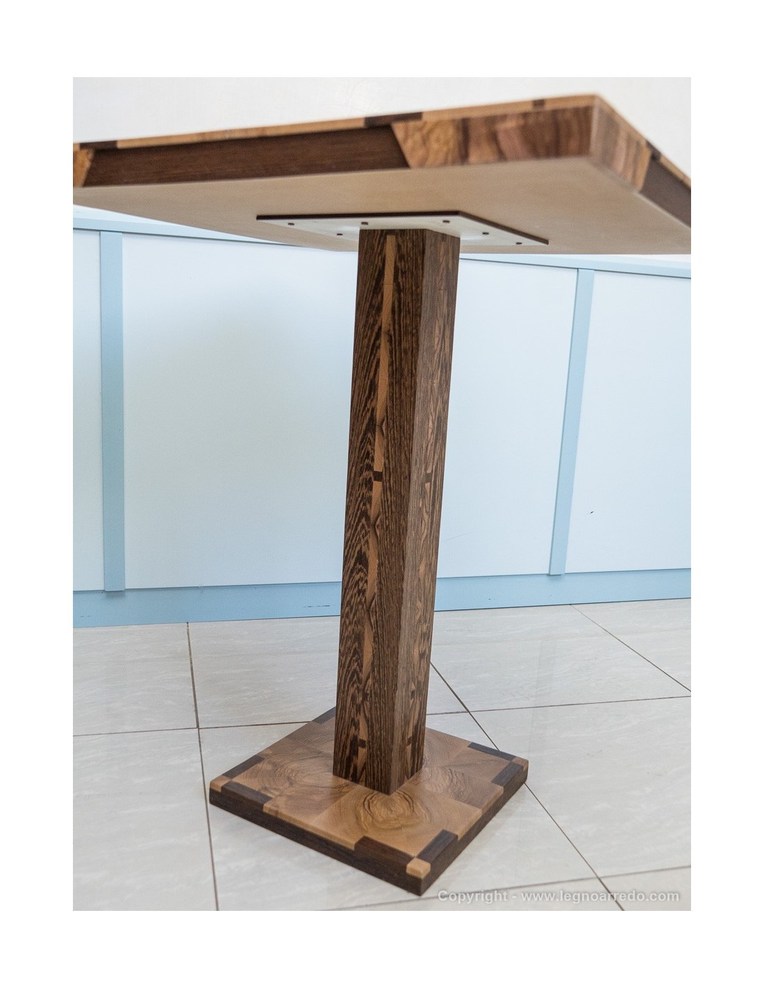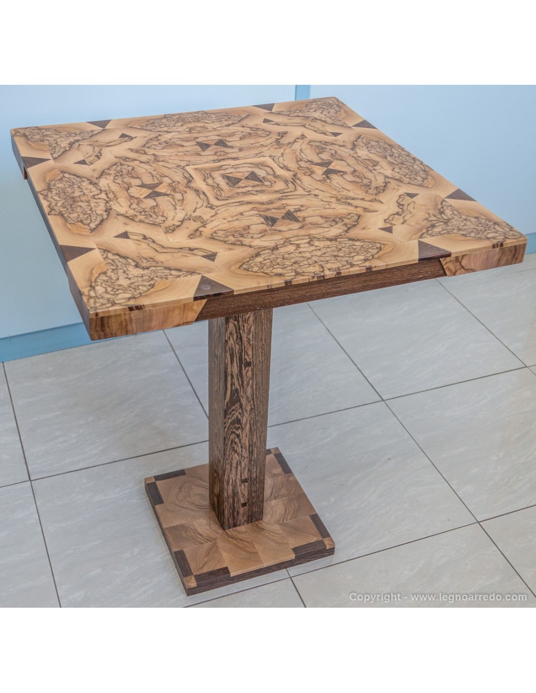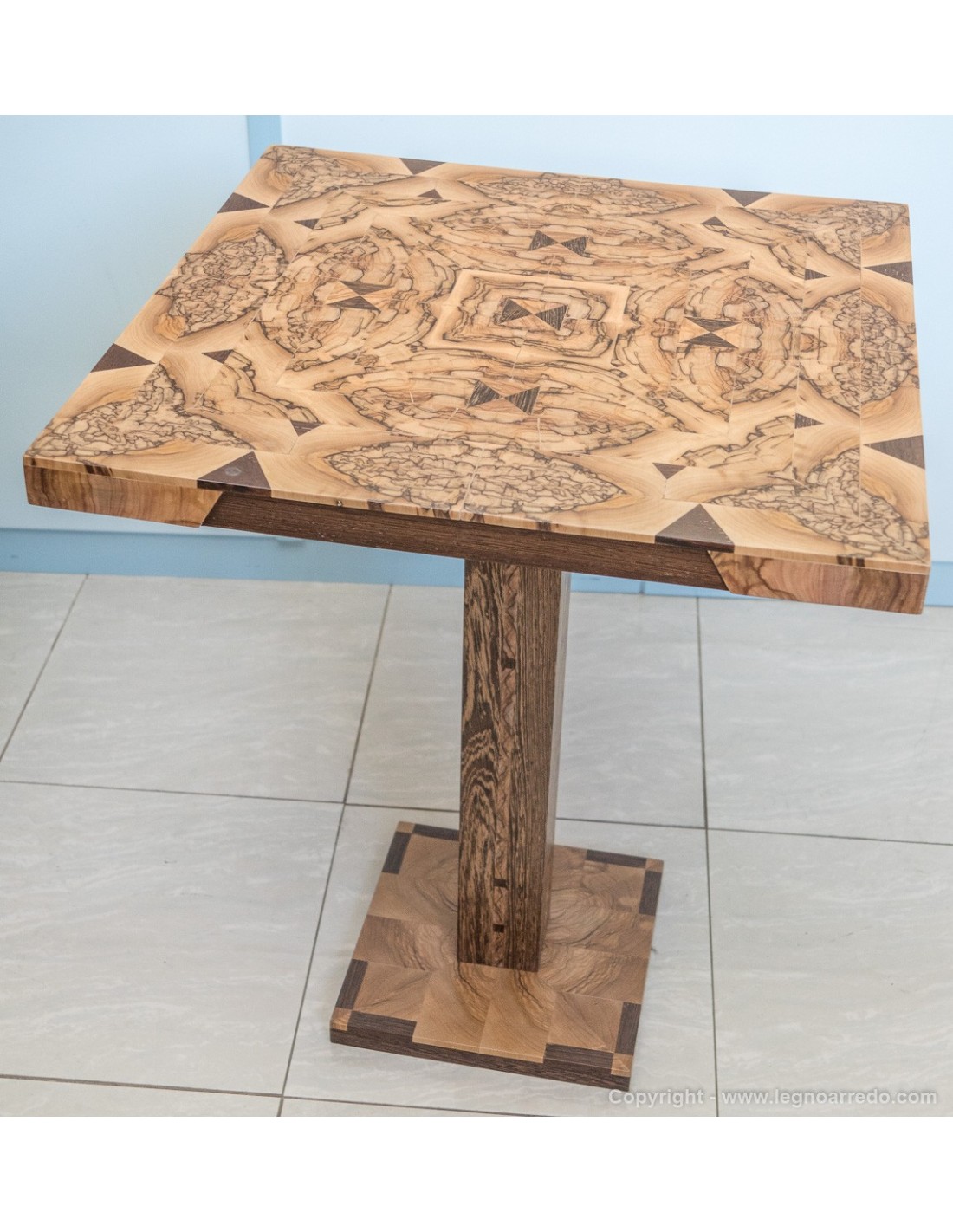 Il design del piede del tavolo è composto da n° 96 pezzi (legno massello di circa 1 cm di spessore) di ulivo e wengé.