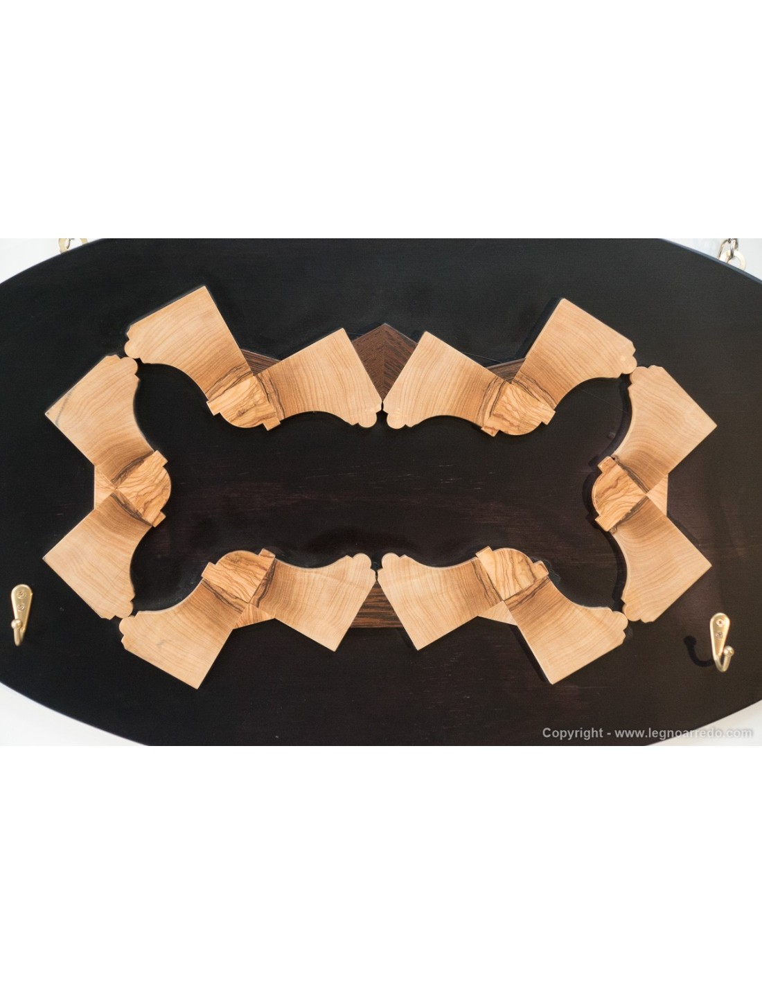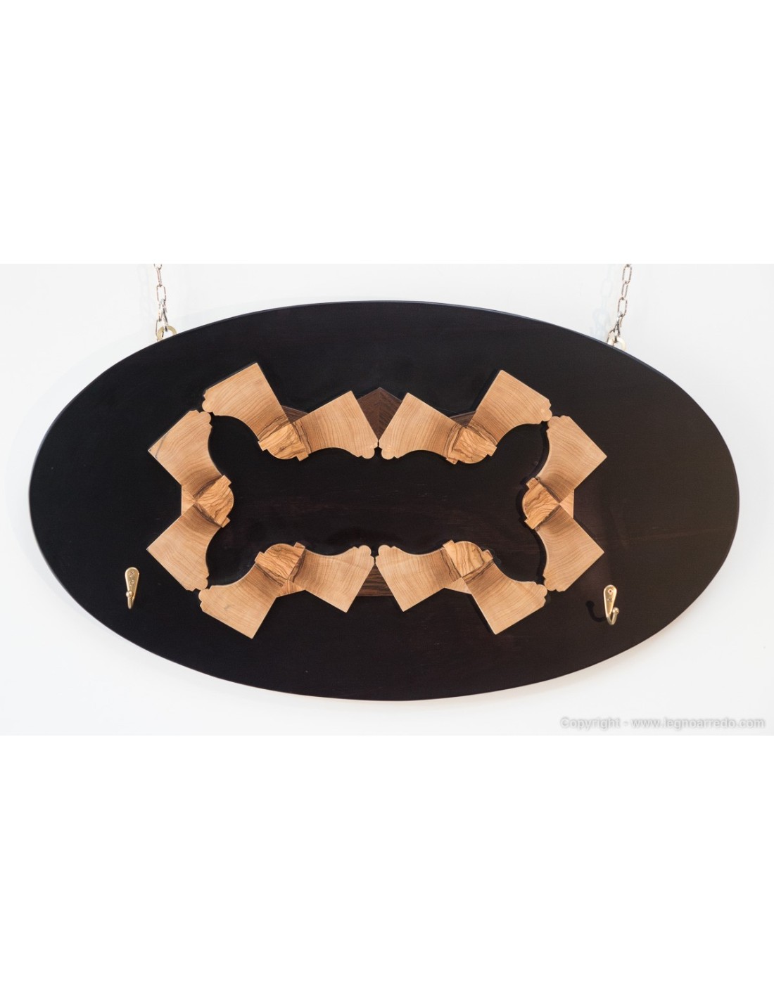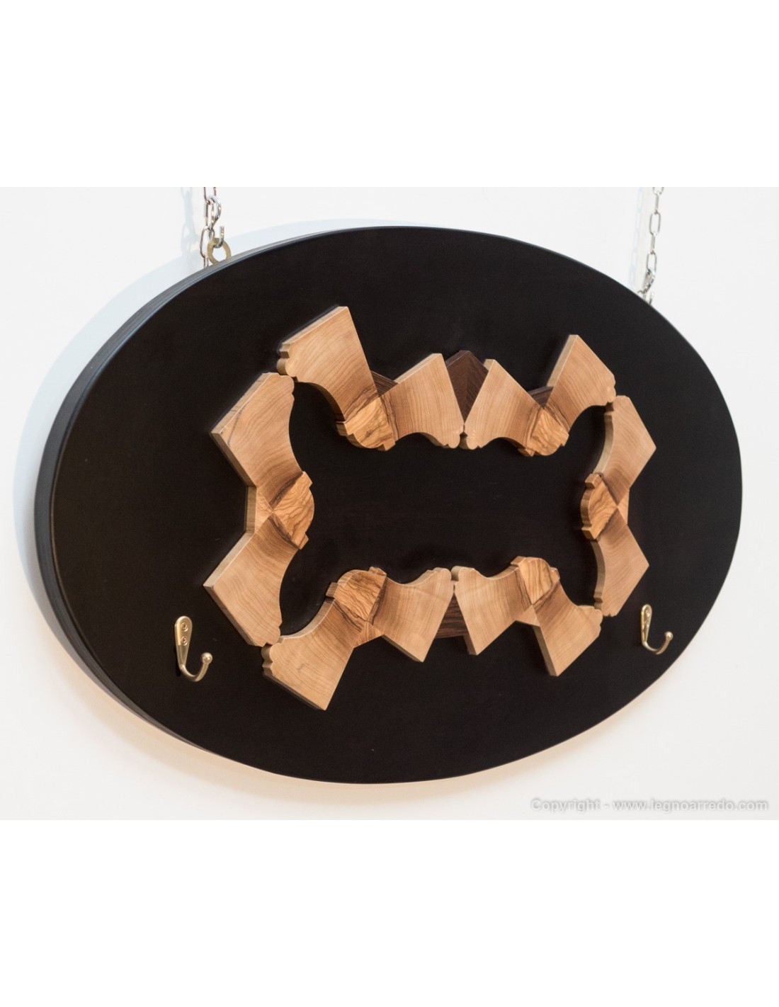 Appendiabiti da parete, costituito da una pregiata ed elegante composizione in legno massello di ulivo e wengé applicata su pannello multistrato colorato.