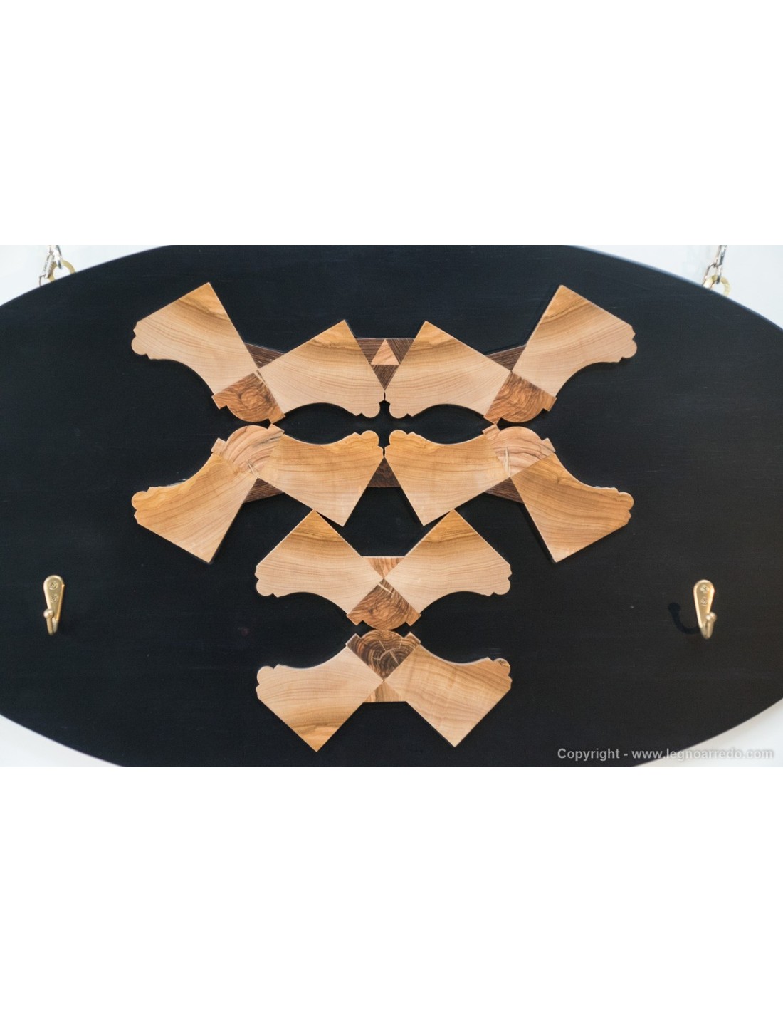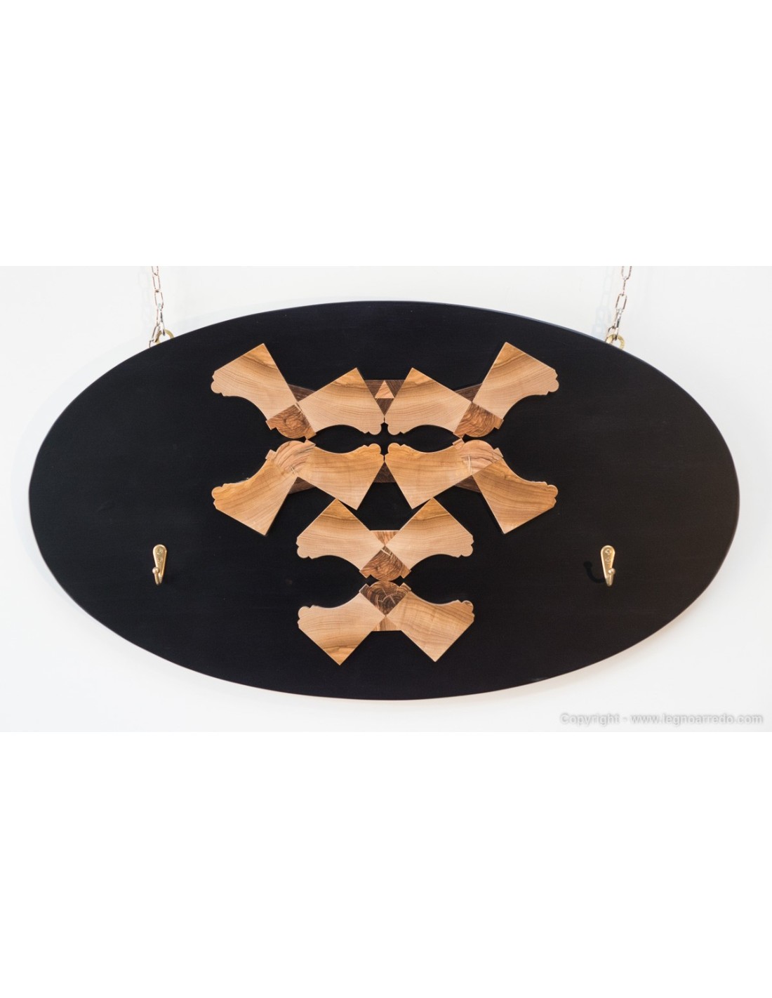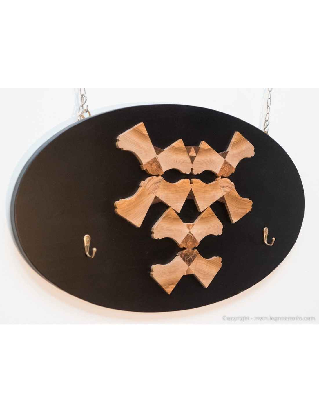 Appendiabiti da parete, costituito da una pregiata ed elegante composizione in legno massello di ulivo e wengé applicata su pannello multistrato colorato.