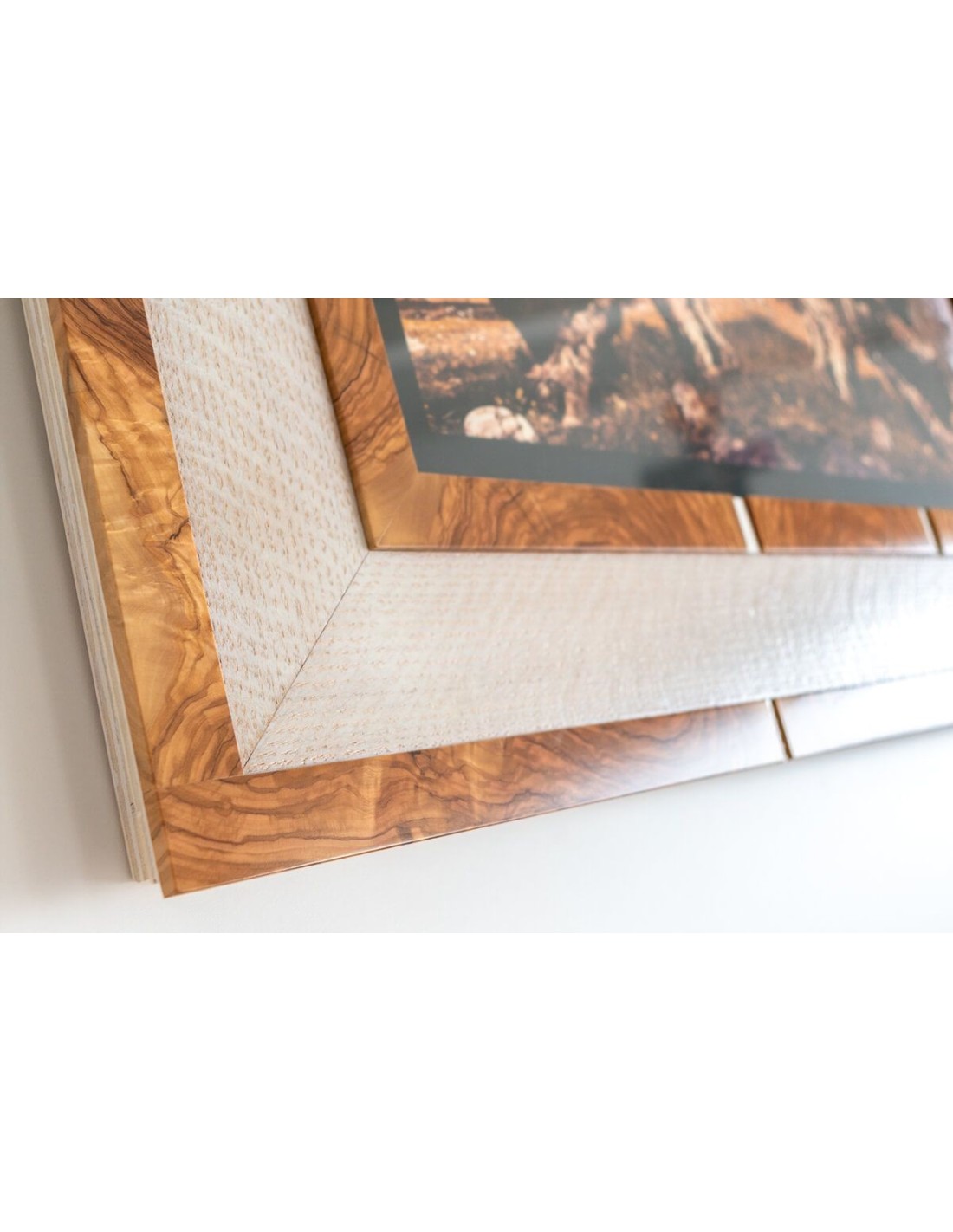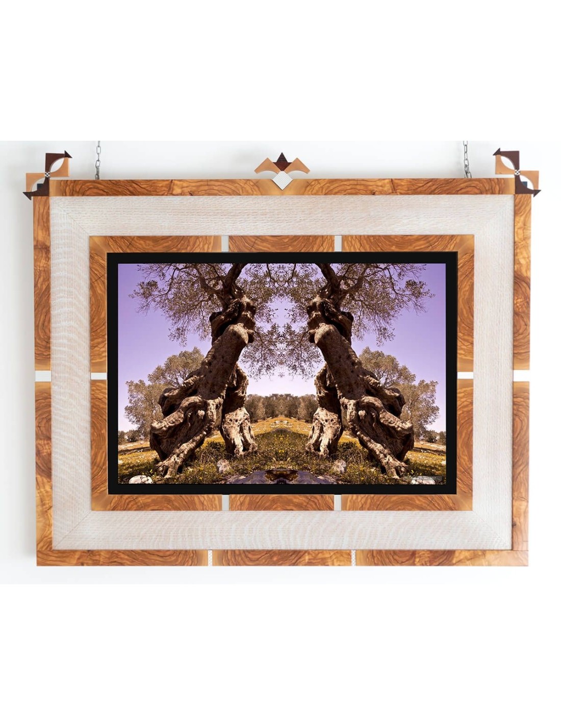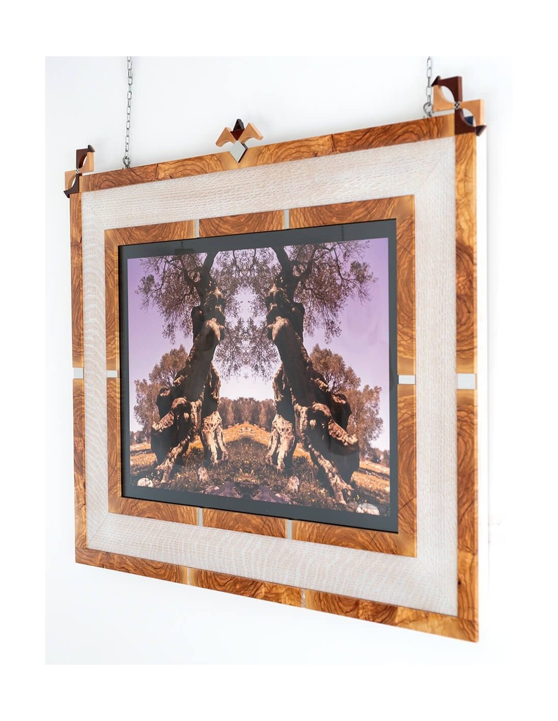 Materiali Cornice: ulivo, rovere colorato bianco, inserti in acciaio.