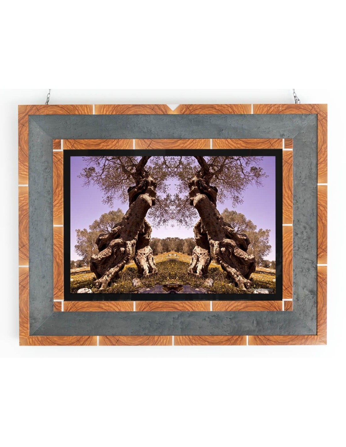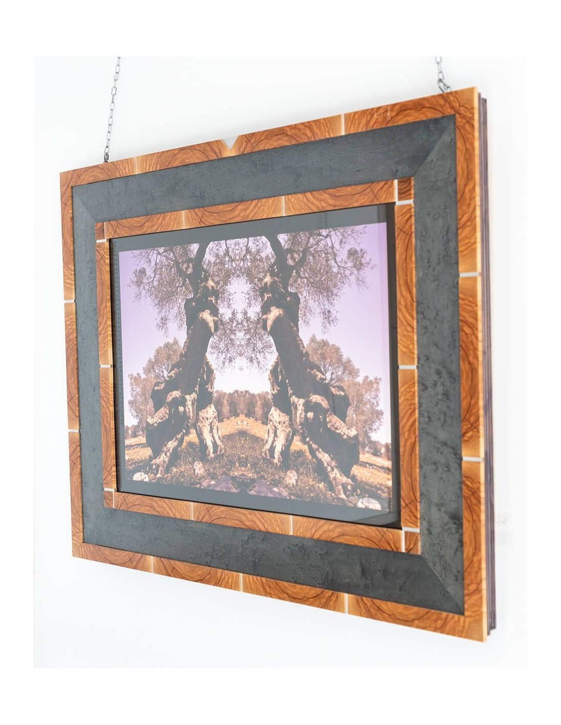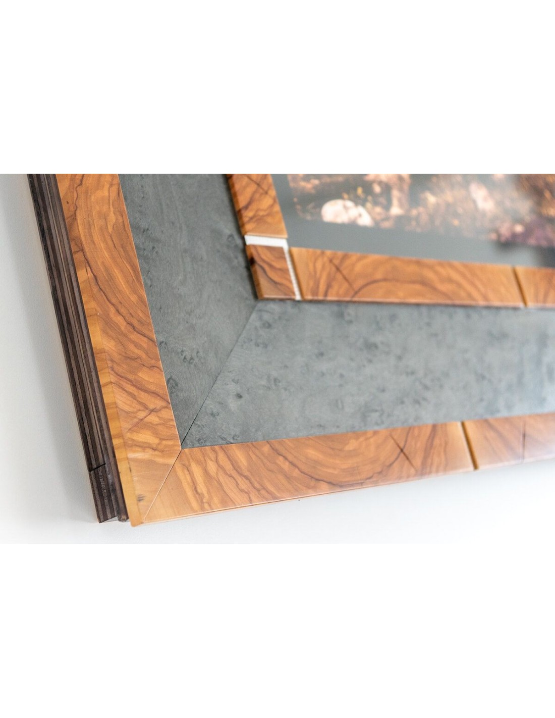Materiali Cornice: ulivo, radica blu, inserti in laminato acciaio.